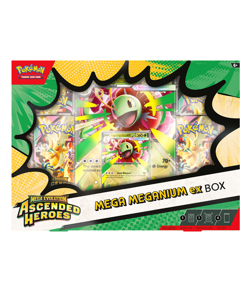 W zestawie Pokémon TCG: Mega Evolution – Ascended Heroes – Mega ex Box znajdziesz Mega Pokemona ex jako grywalną kartę promo foil, a także powiększoną kartę lentikularną z dynamiczną grafiką oraz cztery boostery ze specjalnego dodatku Mega Evolution – Ascended Heroes.