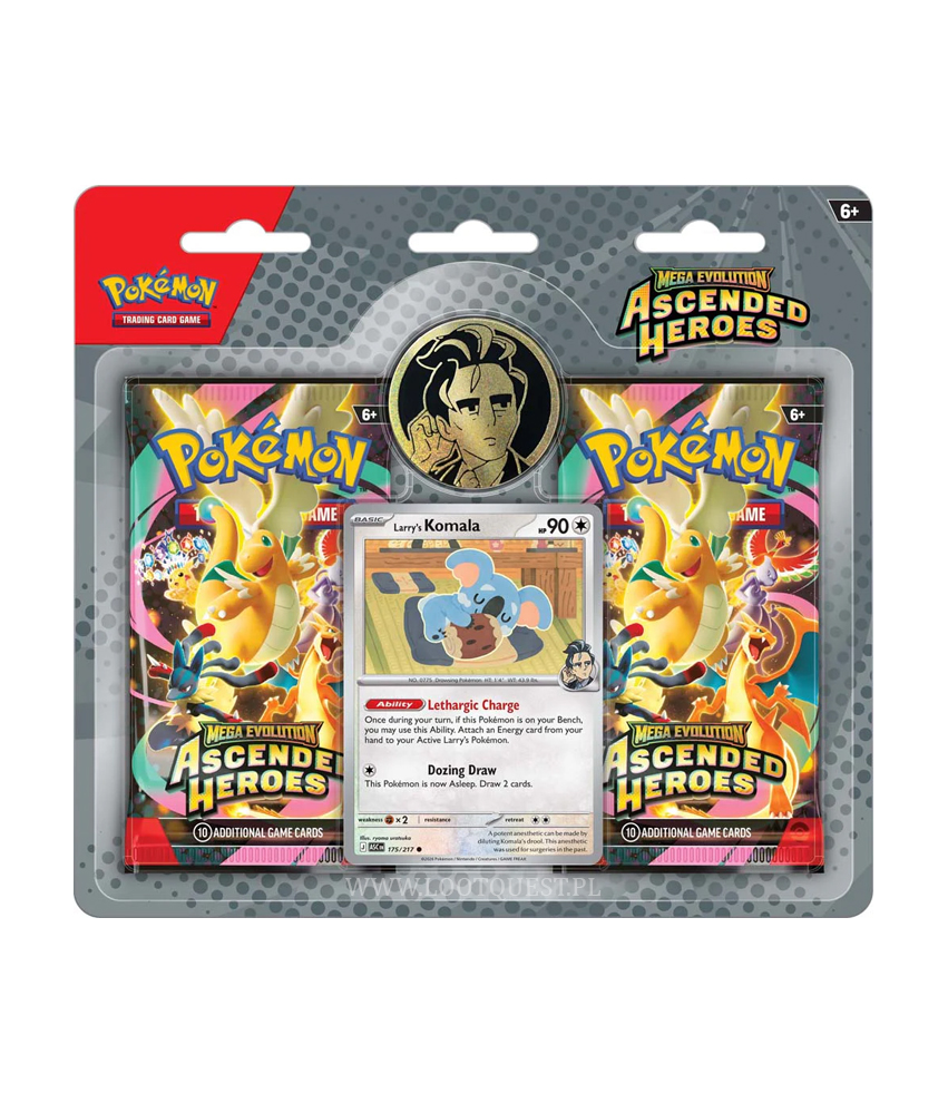 Odwiedzający miasto Medali w regionie Paldea mają okazję stanąć do walki z Larrym i jego Pokémonami typu Normal. W tym zestawie znajdziesz kartę promocyjną przedstawiającą Larry’s Komala, metaliczny żeton z wizerunkiem Gym Leadera oraz dwa boostery z dodatku Pokémon TCG: Mega Evolution – Ascended Heroes.